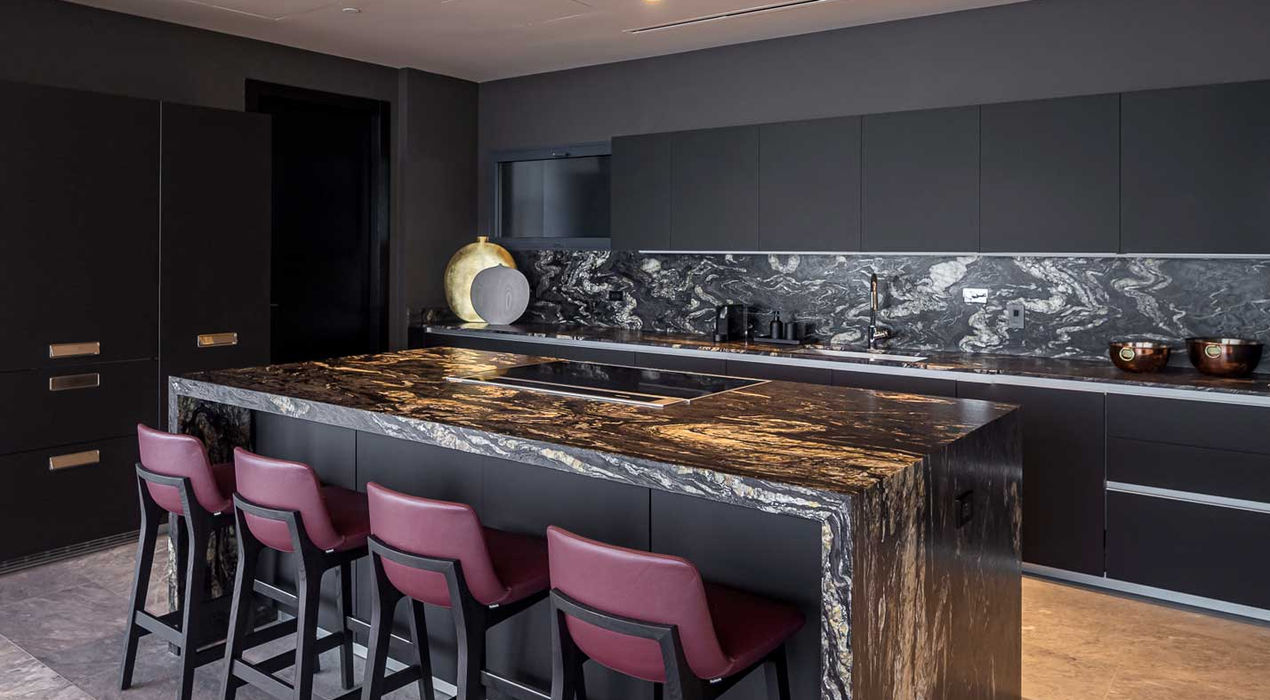 The design incorporates charcoal tones in the open kitchen to unify the space, while neutral shades of beige and cream soften the atmosphere, harmonizing with the sea breeze. Perimeter lighting highlights metallic details in bronze and patinated gold, while glass accessories and walnut wood add color and warmth.